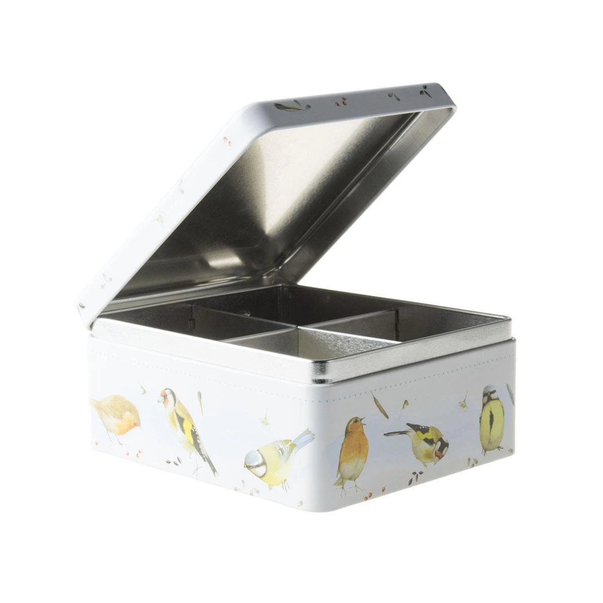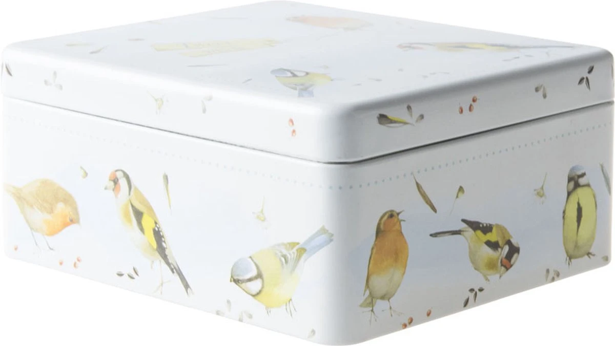 Het theeblik bevat subtiel getekende en prachtig gedetailleerde illustraties van de Nederlandse tuinvogels pimpelmees, roodborst en putter. Het 4-vaks theeblik heeft een afmeting van 15,5 x 13,5 x 7 cm en is gemaakt van blik. Veel theeplezier