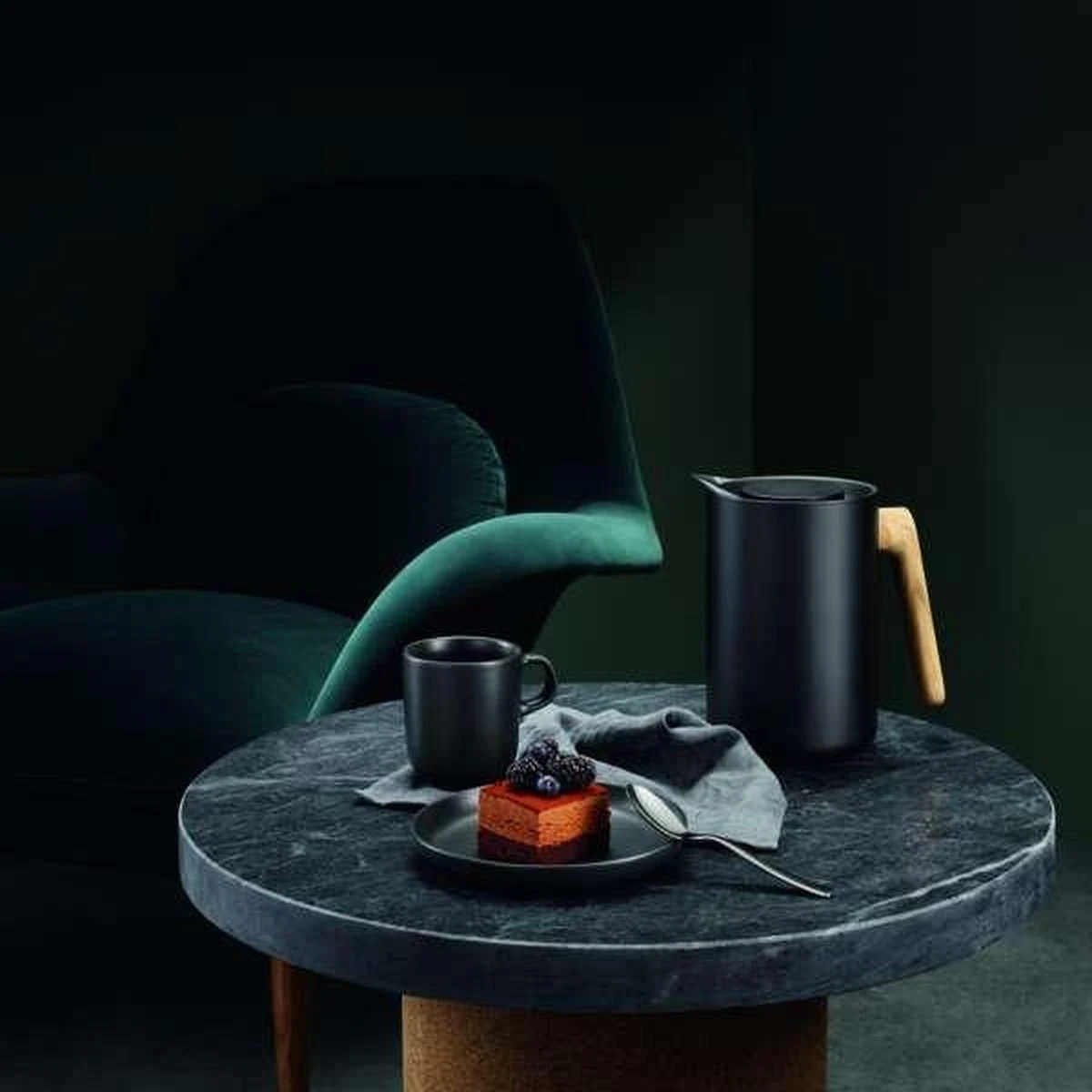 De Nordic Kitchen Thermoskan van Eva Solo is gemaakt van zwart kunststof en past, vanwege zijn vorm en design, perfect bij de andere items uit de Nordic Kitchen serie. De binnenkant van de thermoskan is gemaakt van RVS en zorgt ervoor dat de thee of koffie een stuk langer warm blijft. Dit betekent ook dat de kan erg robuust en schokbestendig is. De unieke eikenhouten handgreep zorgt voor een goede grip tijdens het inschenken. Daarnaast is de RVS schenktuit zo ontwikkeld dat hij 100% drup- en lekvrij is. De thermoskan heeft een inhoud van 1 liter en is zwart van kleur. Hij is ook verkrijgbaar in een zilveren kleur.
